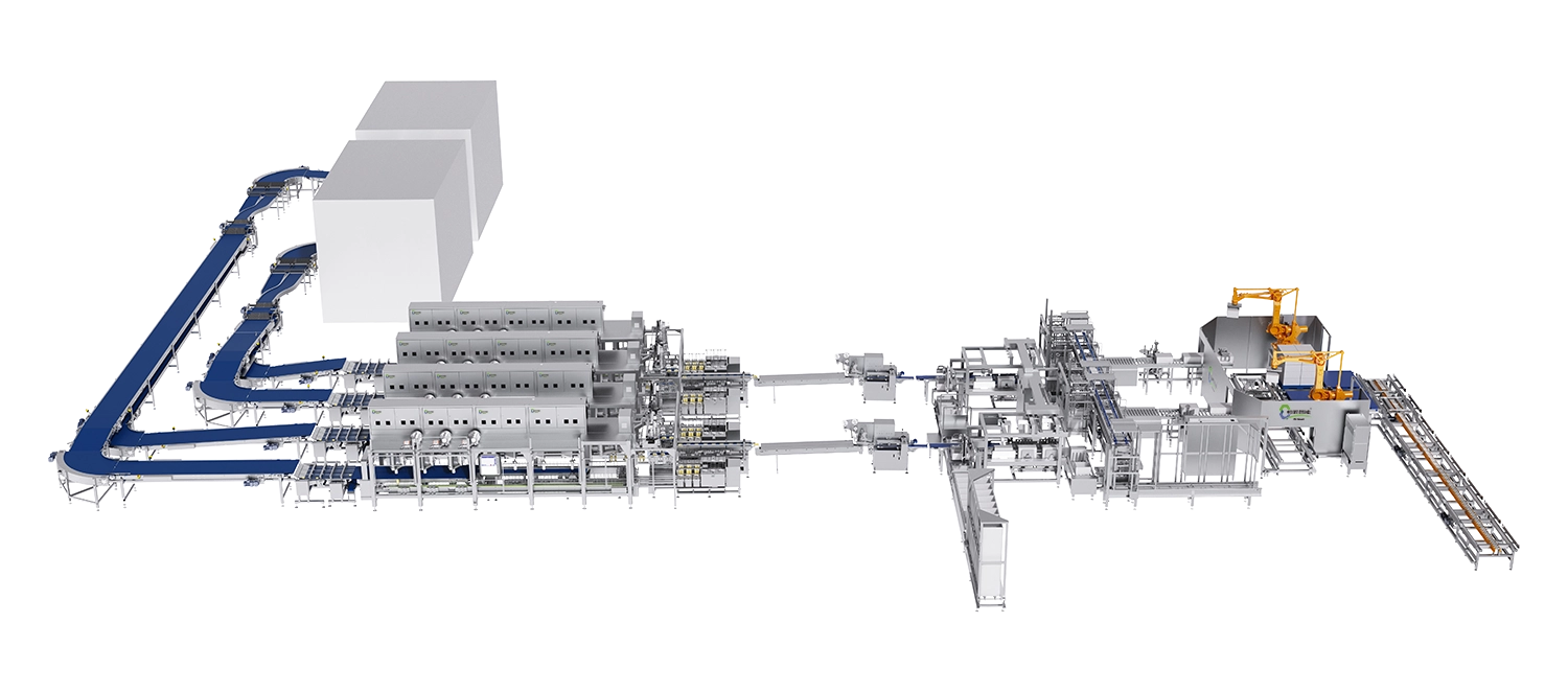 机器人包装线是从对接冷冻隧道开始到包装码垛结束的整个包装产线。产线由整理输送、堆叠、合并包装、合并封箱码垛等部分组成,是恒匠优秀的智慧化工厂解決方案之一;恒匠依据市场对于食品工业自动化需求研发设计机器人包装线可实现不同场景定制化需求。